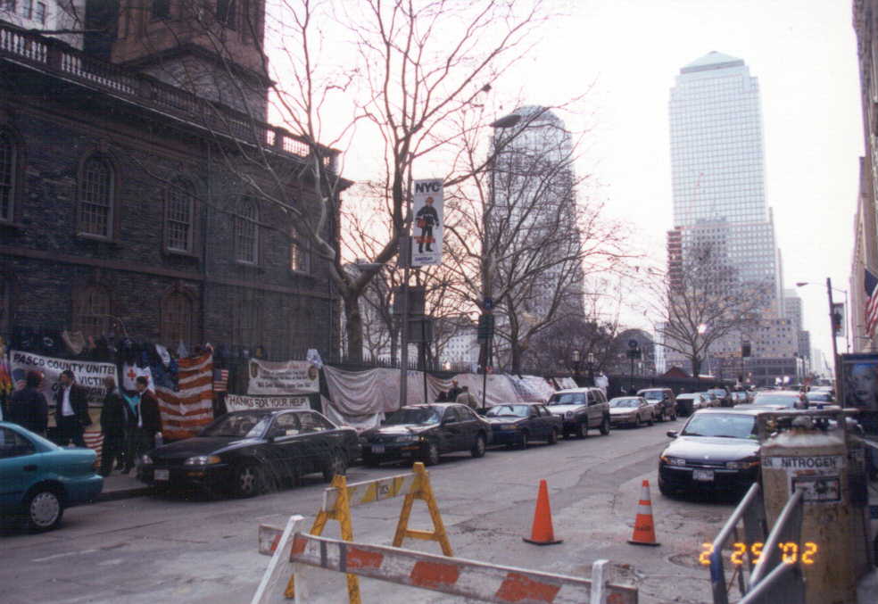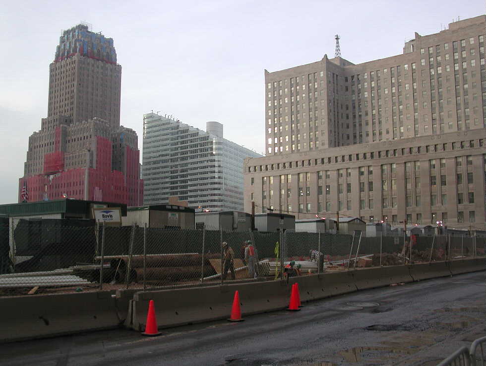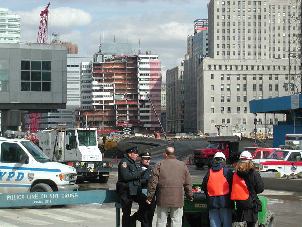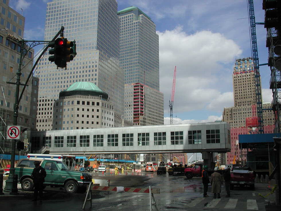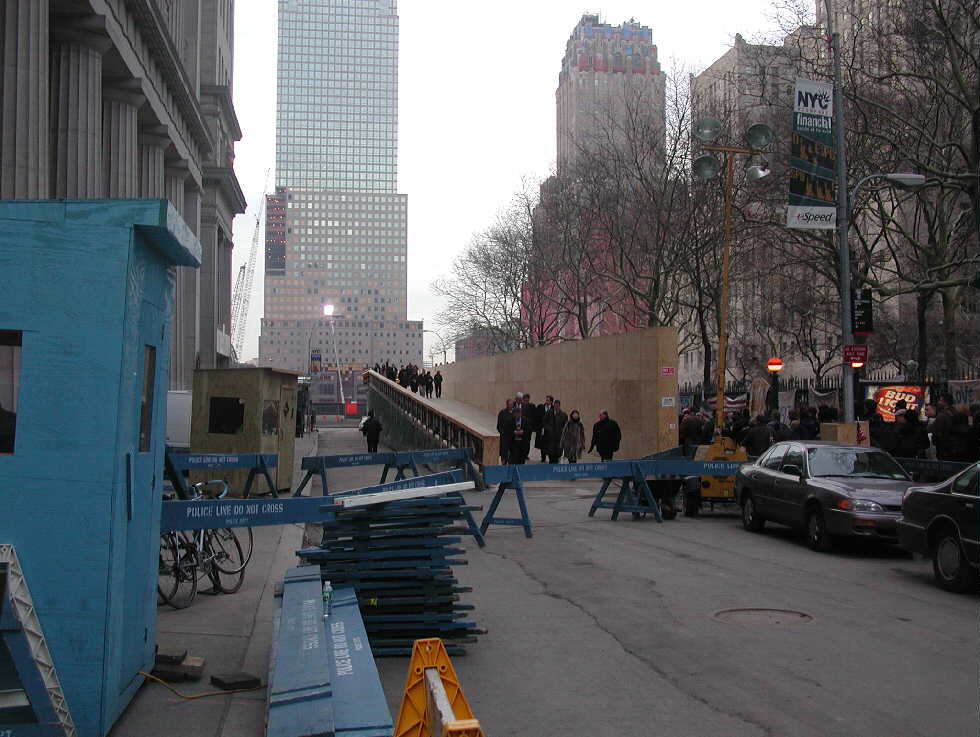 4 March 2002. Entrance to WTC recovery and construction site, looking west from Church Street. American Express building under repair at right distance.