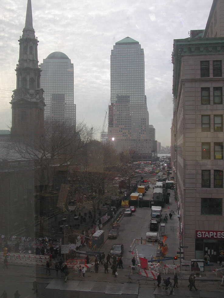 Public observation platform adjoining St. Paul's Chapel and its graveyard, overlooking WTC and Church Street, looking southeast.
