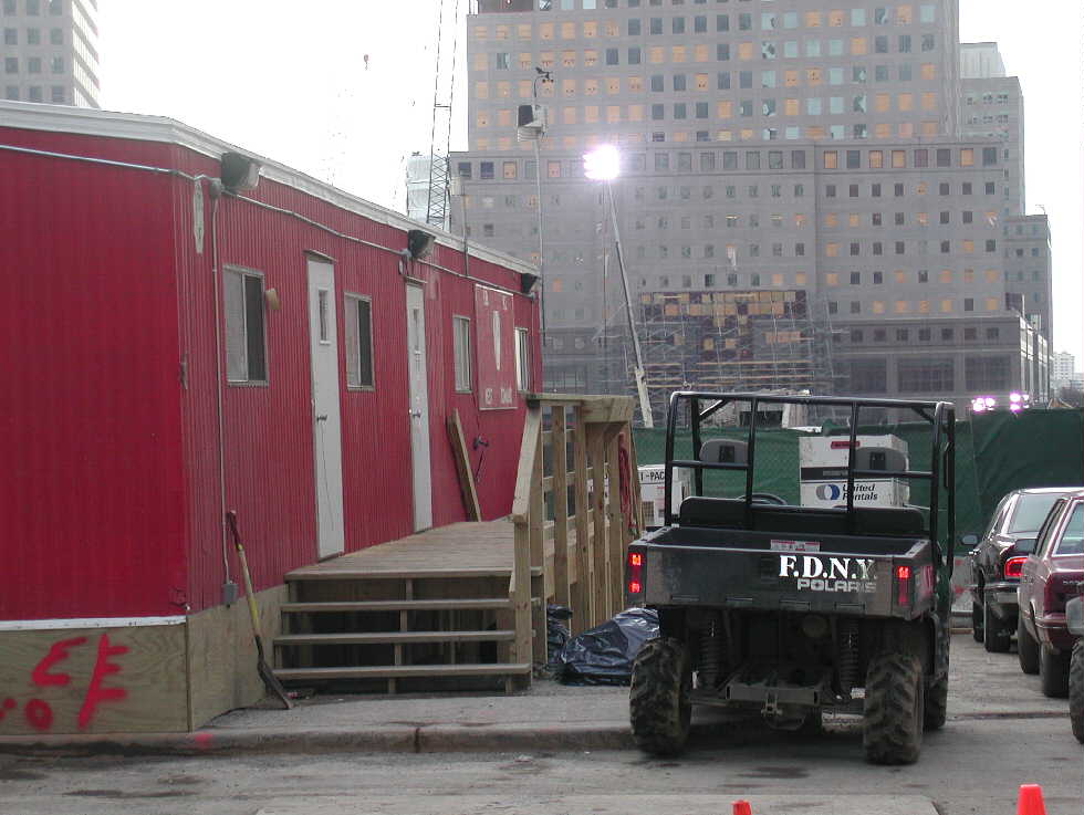 Fire Department temporary facility, WTC site, corner of Church and Vesey Streets; American Express tower in World Financial Center in background, looking west.