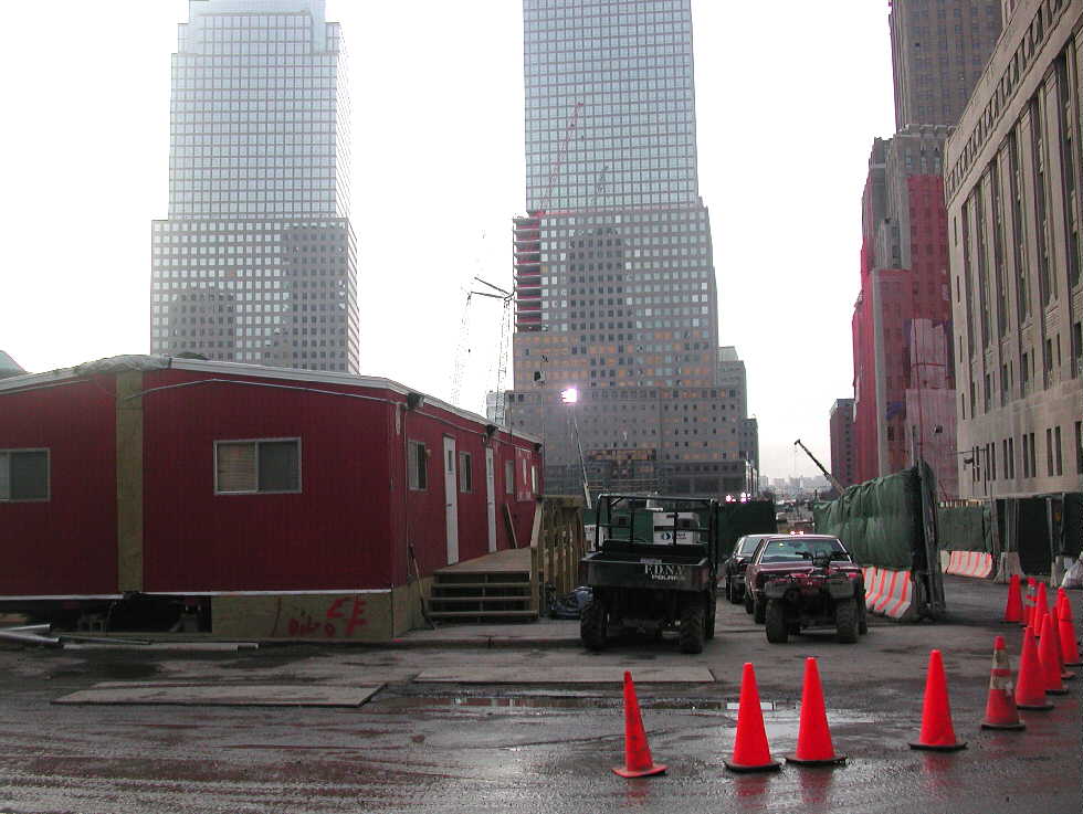 Temporary construction trailers along WTC site excavation, opposite observation platform across Church Street, looking northwest.