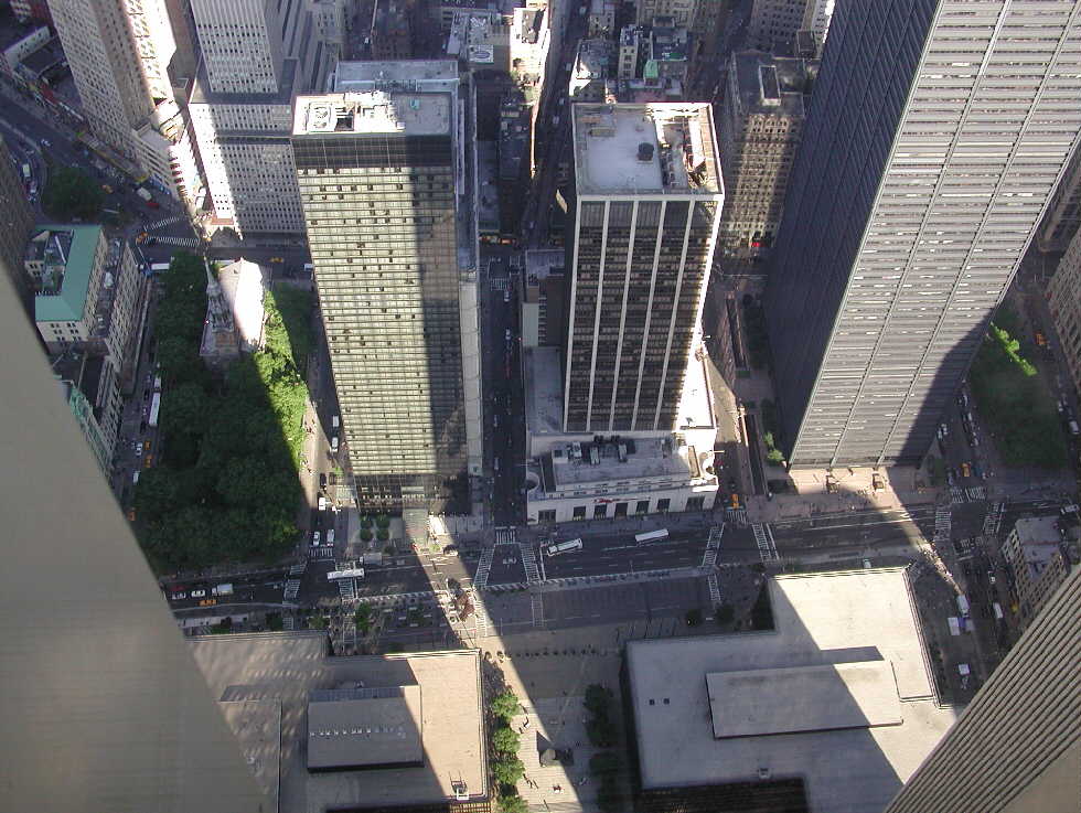 May 31, 2001. Photo from Windows on the World Restaurant, 106th Floor of WTC North Tower, looking down and east to Church Street. Sunlight between the two towers lights the Millennium Hotel and trees around St. Paul's Chapel. The observation platform shown below was constructed along the street between the hotel and chapel. Map of area: http://nunce.org/wtc/wtc-map2.jpg