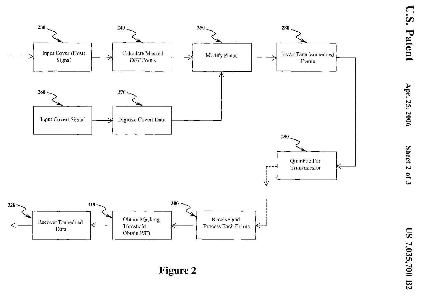 Gopalan, K.G. et. al. Data Embedding In Audio Signals. Aerospace Conference, 2001, IEEE Proceedings. vol. 6, Publication Date Mar. 10-17,2001, pp. 2713-2720. cited by examiner . Garcia, Richard A. digital Watermarking of Audio Signals Using a Psychoacoustic Auditory Model and Spread Spectrum Theory. University of Miami, Apr. 21, 1999. cited by examiner . Tilki, John F. et al. Encoding a Hidden Auxiliary Channel Onto a Digital Audio Signal Using Psychoacoustic Masking. 1997. cited by examiner . Cvejic, Nedelijko et al. Audio Watermarking Using m-Sequences and Temporal Masking. Applications of Signal Processing to Audio and Acoustics. Oct. 2001, pp. 227-230. cited by examiner . Bassia, Paraskevi et al. Robust Audio Watermarkingi in the Time Domain. IEEE Transactions on Multimedia. vol. 3, No. 2, Jun. 2001. cited by exami- ner . Swanson, Michelle D. et al. Multimedia Data-Embedding and Watermarking Technologies. Proceedings of the IEEE, vol. 86, No. 6, Jun. 1998, pp. 1064-1087. cited by examiner . Anderson, Ross L. et al. On the Limits of Stenography. IEEE Journal on Selected Areas in Communication. vol. 16, No. 4, May 1998. vol. 16, No. 4, pp. 474-481. cited by examiner . Boney, Lawrence et al. Digital Watermarks for Audio Signals. Multimedia Computing Systems, 1996, Prcoeedings of the 3rd IEEE International Conference on Multimedia. pp. 473-480. cited by examiner. |