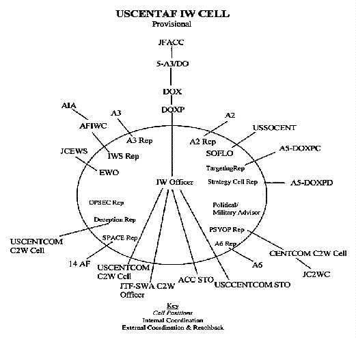 - Target development team members in the AOC for Information Warfare and Command and Control Warfare (IW/C2W) must be defined. The target development A3/A2 members in the AOC should be augmented as needed by members of the Air Force Space Support Teams (AFSST), Information Warfare Support Teams (IWST), Joint C2W Center (JC2WC) Teams, Land IW Activity (LIWA) and Naval IW Activity (NIWA)/Fleet IW Center (FIWC). These players can assist with IW/C2W expertise for joint/combined air campaign level targeting. The A3/A2 must determine the mix of augmentation and reachback needed to augment his own IW/C2W expertise and what the role, if any, of the 9AF IW Squadron and other IW's will be, once formed. Figure 11.3 illustrates the proposed USCENTAF IW Cell.