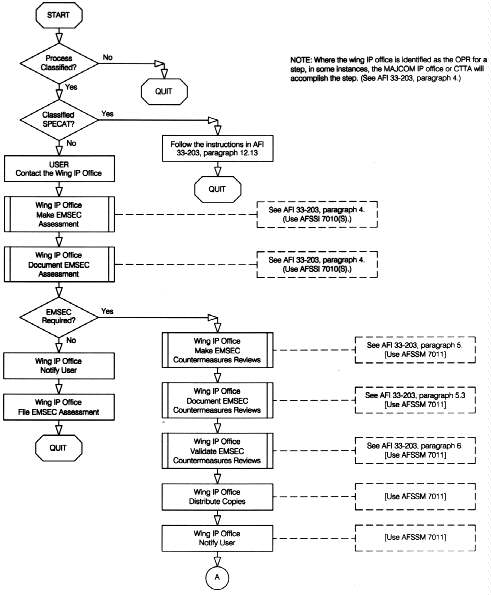 1. Introduction. The Air Force EMSEC process has experienced many changes. Although these changes were attempts to meet the variances of a dynamic world, they require security protection measures far beyond the needs of the average user. In the past, EMSEC tended to stand alone; however, IP now requires a more balanced approach not only to the control of compromising emanations, NONSTOP, and HIJACK, but to communications security (COMSEC); COMPUSEC; and SATE as well. The prime objective of EMSEC is to identify requirements from the standpoint of IP risk management principles and provide the appropriate protection at the least possible, or no, cost. Key to this process is a partnership between the wing IP office and the user. The wing IP office assesses the need for EMSEC as part of IP; determines the required countermeasures; advises commanders of vulnerabilities, threats, and risks; and recommends a practical and feasible course of action to the wing commander. The user applies identified countermeasures.