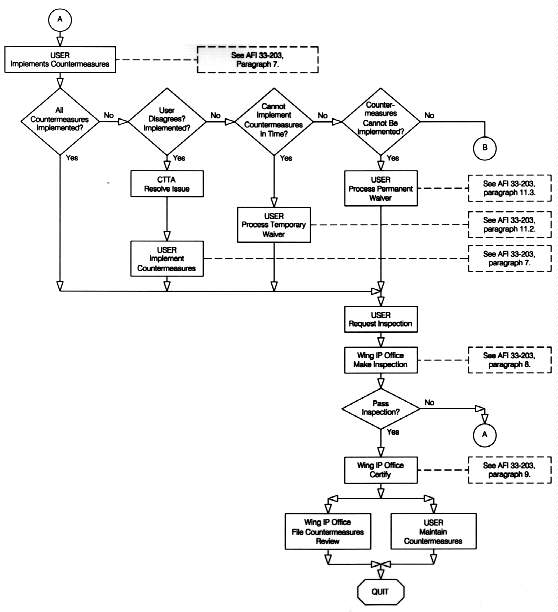 8. Emission Security Inspection. Upon notification from the user, the wing IP office makes an EMSEC inspection to make sure the required EMSEC countermeasures are effectively applied or implemented. The EMSEC countermeasures review is the basis for the EMSEC inspection. The user must correct deficiencies discovered by an EMSEC inspection or request a temporary or permanent waiver before processing classified national security information.
