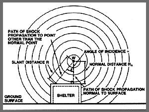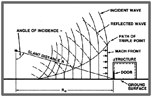 The variation of the pressure on the door surface is a function of the "angle of incidence": The angle of incidence is formed by a line which defines the normal distance between the point of detonation and the door, and a line which defines the path of shock propagation between the center of the explosion and any other point of the structure in which the door is located.
