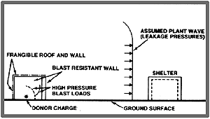The use of cubical type structures with one or more surfaces either sufficiently frangible or open to atmosphere will normally provide adequate venting. This type of structure permits a blast wave from an internal explosion to spill over onto the exterior ground surface in a condition known as "leakage pressure".