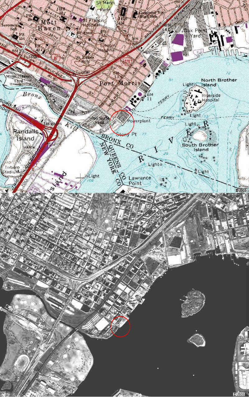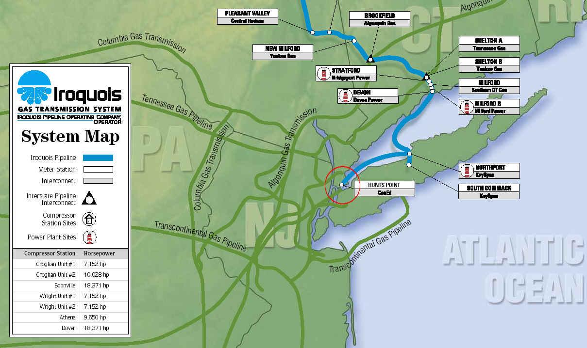 A small brick facility houses the landfall controls of the pipeline which crosses Brooklyn and the East River into The Bronx and connects to the transcontinental pipeline which crosses upper Manhattan and the Harlem River into The Bronx, as shown on the NYC gas pipeline maps below. The pipeline serves The Bronx and Westchester County. It probably connects to a nearby pipeline by Iroquois Gas Transmission which delivers gas to the city across New York State from the north and underwater of Long Island Sound to Hunt's Point.