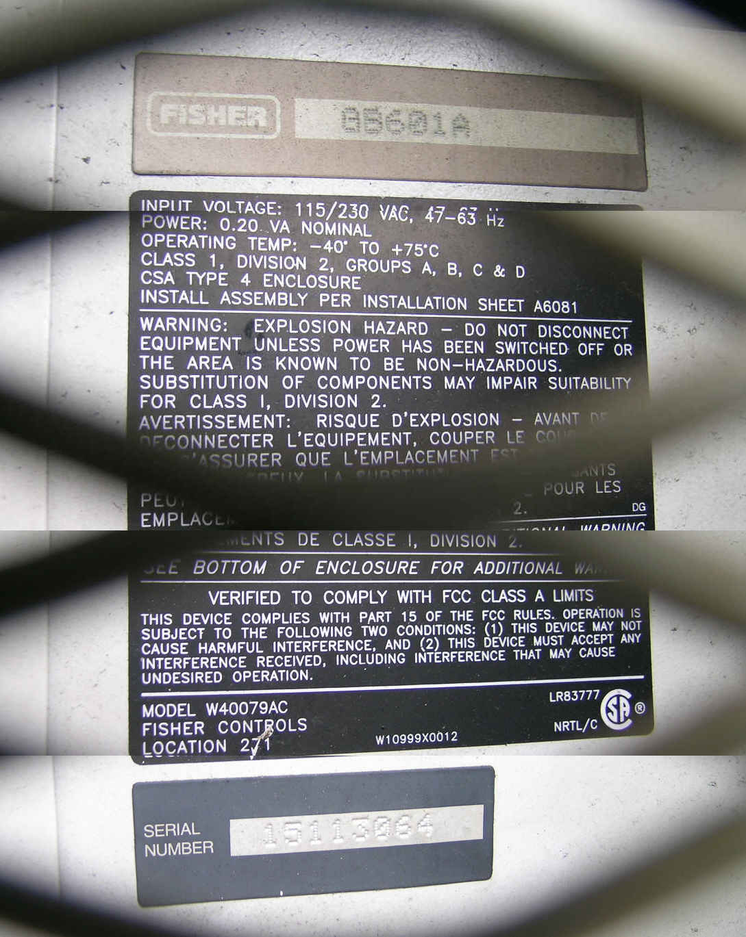 viewing of the interior regulating device identification and specifications. Note the FCC classification. Fisher Controls on the web.