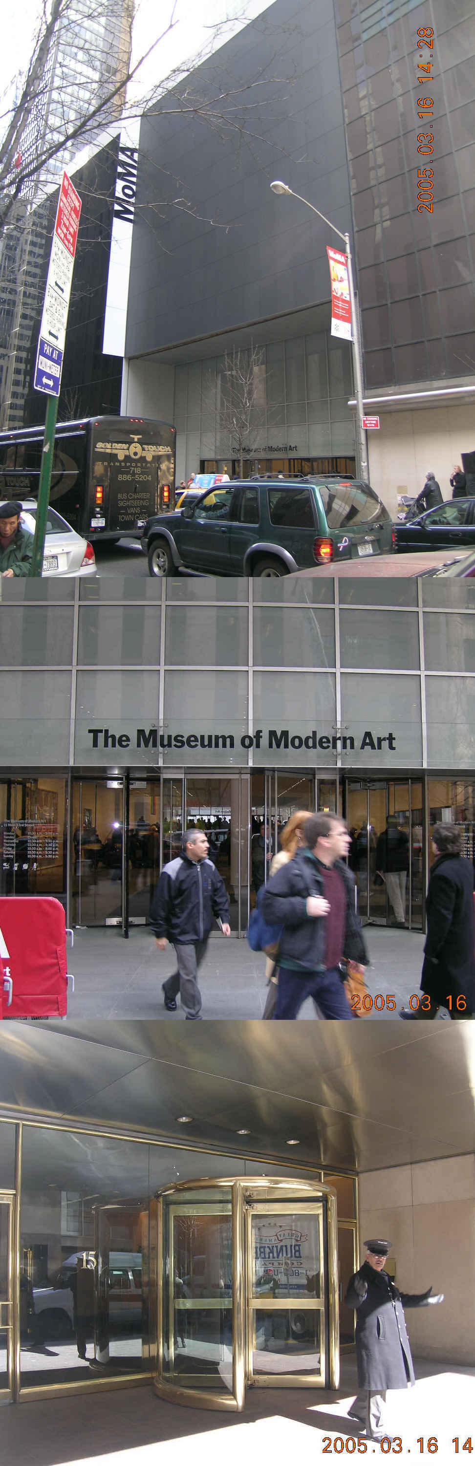 Museum of Modern ArtThe reconstructed museum has just reopened and its lack of security at the entrance other than for crowd-control, could be due to having a Japanese architect, feeling invulnerable, or the sky-high cost precluded cost of security, or simple belief that no harm will come to a world-class cultural institution despite its all glass front and through-block lobby. The entrance to the high-rise museum apartments (55 floors) next door is more discreet and protected, though it lacks street barriers. |