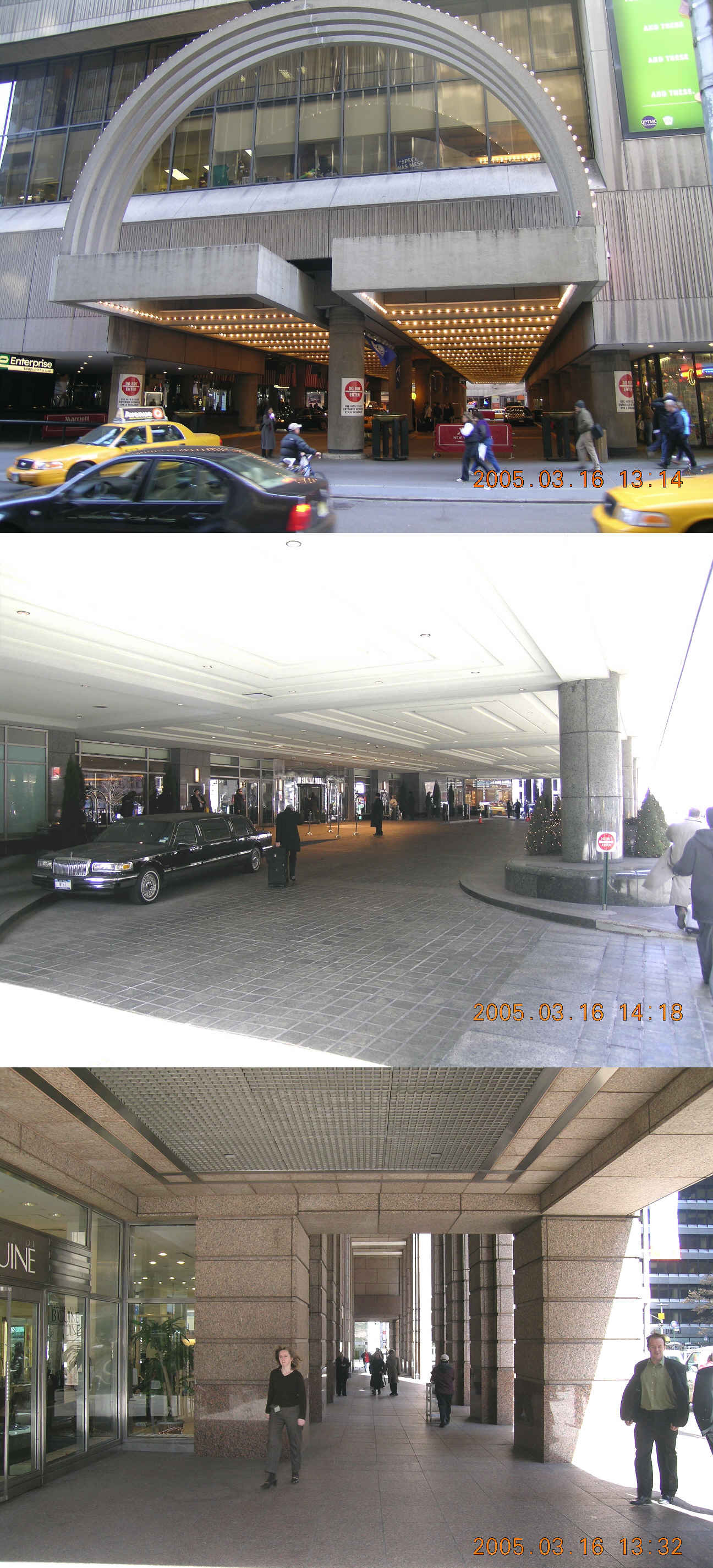 Marriott Marquis Hotel, the Hilton Hotel and 1177 Sixth Avenue Offices Pass-Through BuildingsThe high-rise Marriott Marquis Hotel (50 floors), the New York Hilton Hotel and Apartments (34 floors) and 1177 Sixth Avenue office building (49 floors), repsectively, below, exemplify the many vehicular and pedestian pass-throughs and arcades that expose high-rise structural members to explosive blasts. Some pedestrian pass-throughs are protected with bollards but those for vehiculars are usually not except at high-value targets like government and military facilities. |