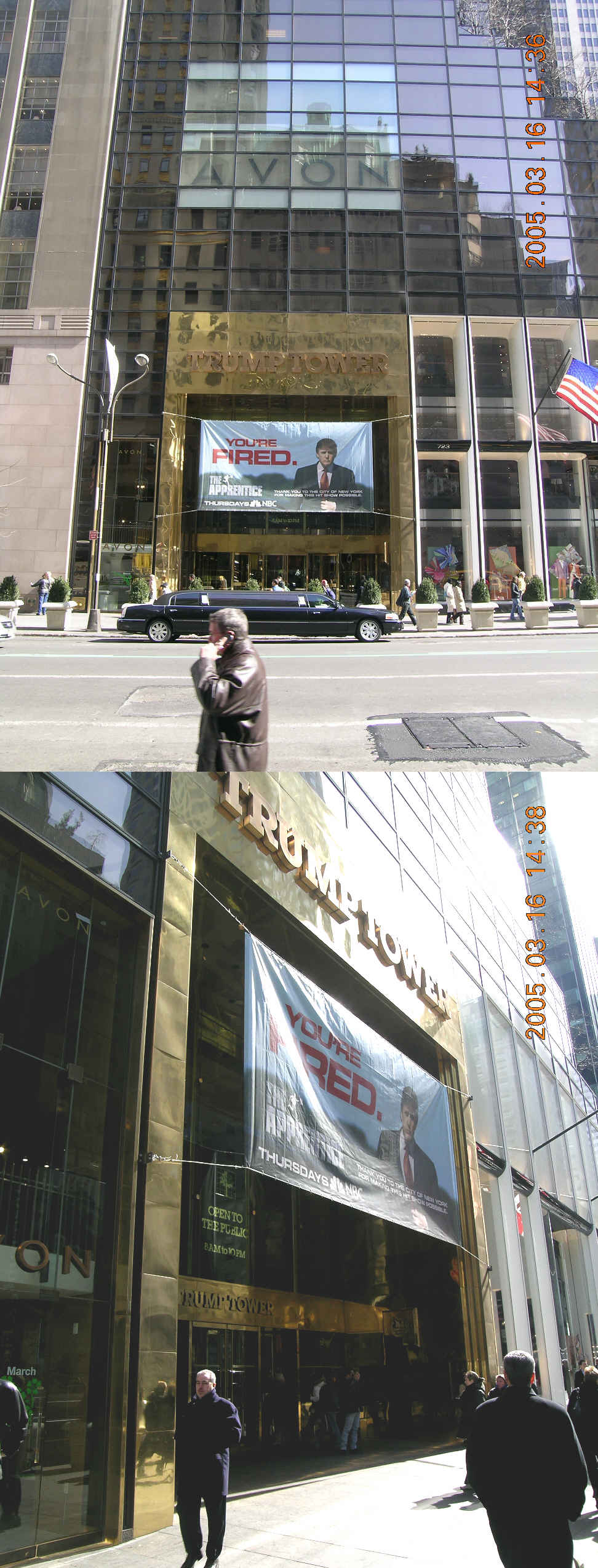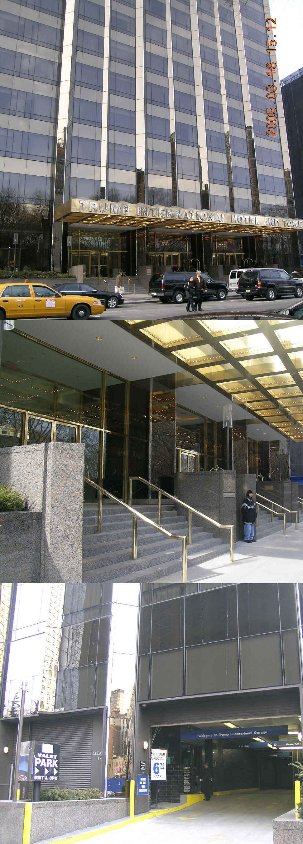 Trump TowerThis shows perhaps the only use of a stretch limo as a barrier to supplement the lightweight decorative planters -- which could be easily dislodged by a speeding attack vehicle, or best, circumvented by coming at the tower from the wide-open Tiffany's end of the open sidewalk. The main entrance leads to a multi-level atrium provided under a city program for additional floors. This vulnerable cavity is located directly below some of the most expensive apartments and offices in the world. Trump Tower (50 floors) adjoins equally tall buildings on three sides which would concentrate an exterior blast against the fragile glass facade -- an outcome of the London Center City blast in the 1990s. The entrance to Trump Tower multi-million-dollar apartments is on a side street, lightly protected with planters altthough the glass-facade is vulnerable to an exterior blast. Presumably Mr. Trump has the only long-term parking permit to block a traffic lane on jam-packed 5th Avenue. On The Apprentice banner, Mr. Trump unintentionally if macabrely jokes: "Thank You to the City of New York for Making this Hit Show Possible." |