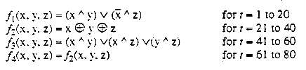 3. (U) There are four functions, F = (f1, f2, f3, f4) used in the hash. Which function is used is dependent upon the internal step, t, of the SHA. Each is a mapping from V96 to V32 and is listed below in hexadecimal format.