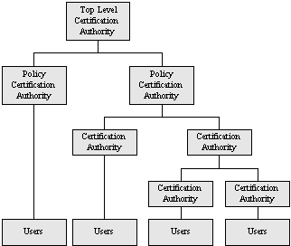 The certification hierarchy for HMG will consist of four types of certifying entity : Top Level Certification Authority, Policy Certification Authority, Certification Authority, and User.