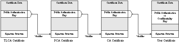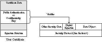 Signatures are also applied to user data in order to verify its integrity and origin. The signatures generated are appended to the used data as part of the security protocol used to transfer data between two entities (See section 4). A signature is verified using the public authentication key of the entity which signed the data object. Once the authenticity of the data object has been established, the certificate containing the public authentication key must itself be verified as described in section 2.4.
