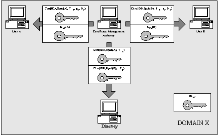 If User A (IDA) needs to exchange enciphered data objects with User B (IDB) in the same domain (Domain X), they are each allocated the following by Certificate Management Authority X. Item (a) is distributed to each user through a secure channel, item (b) may be distributed to users or posted in the domain's directory, item (c) is only posted in the directory. The initial distribution of secret key tokens is outside the scope of this paper, however subsequent distributions may use the electronic mail system and the confidentiality service provided by the security protocol.