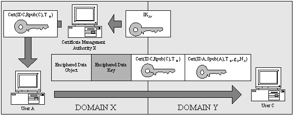 If User A needs to exchange enciphered data objects with User C (IDC) in a different domain (Domain Y), the receive certificate of User C will not be available - unless User C has already received enciphered data objects from a user within the first domain. In this case User A passes User C's distinguished name to Certificate Management Authority X which deterministically generates a public receive key for User C, by the following processing.