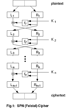 The following diagram illustrates a general Feistel-structured SPN. Basic operation is as follows. A message block of 2n bits is input and split into a left half L1 and a right half R1. The right half and a subkey K1 are input to a "round function", f1, the output of which is used to modify (through XOR addition) the left half. Swapping the left and right halves completes round one. This process continues for as many rounds as are defined for the cipher. After the final round (which does not contain a swap in order to simplify implementation of the decryption process), the left and right halves are concatenated to form the ciphertext.
