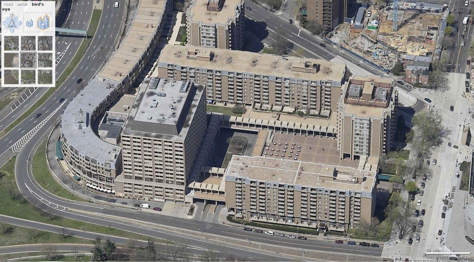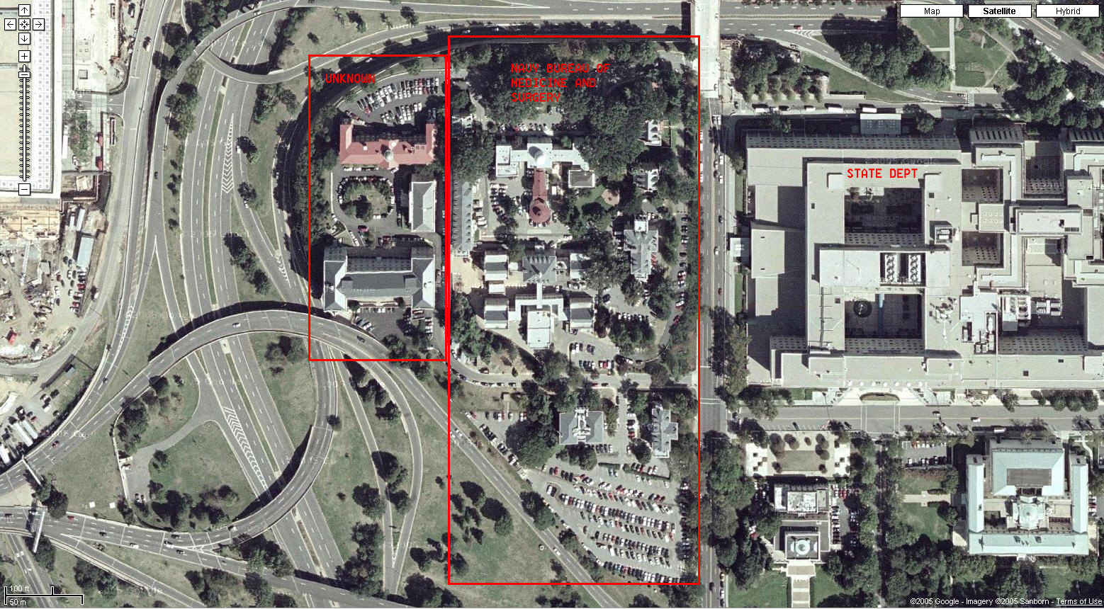[Concerning the previous three listings, the Navy's Bureau of Medicine and Surgery (BUMED) complex is located at D Street NW and 23rd Street NW, west across the street from the State Department, and an online campus plan identifies the buildings in use. However, three structures to the west of BUMED are exluded from the campus plan and their use is unknown. See below.]