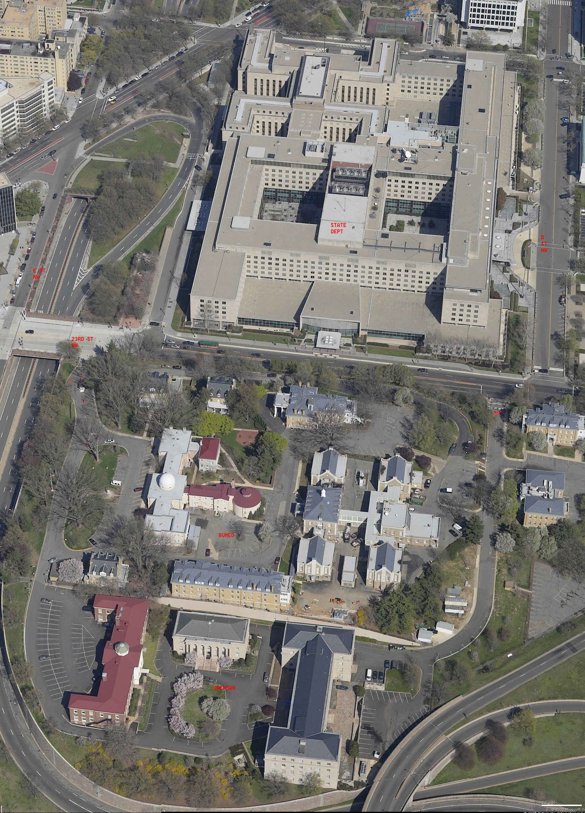 [4] 2430 E Street NW complex (includes Buildings 7, 9, 11 and 12 and the North, East, Central and South Buildings) [New buildings. This is the location of the original CIA headquarters, across the street from the State Department. State has several offices listed in the complex.]