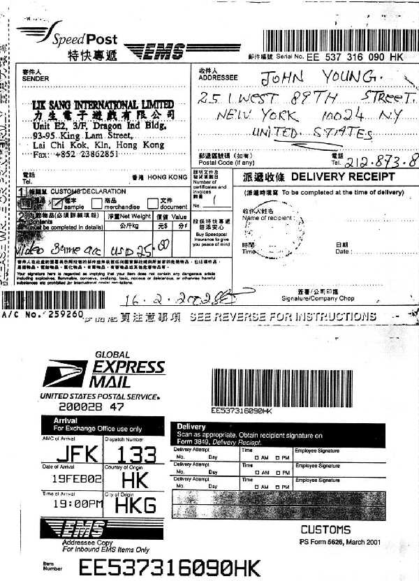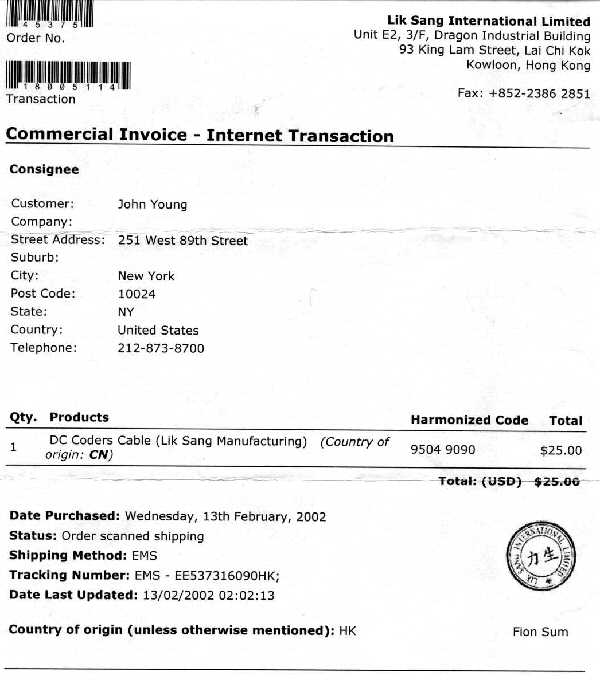In response to these messages describing US Custom's refusal to allow import of a "DC-coder cable" due to an alleged DMCA violation, Cryptome placed an order for the DC-coder cable on Feburary 13, 2002, and today it arrived by Global Express Mail, thus demonstrating a double standard for DMCA-retricted import based on type of shipping system. Documentation on the order and receipt below.