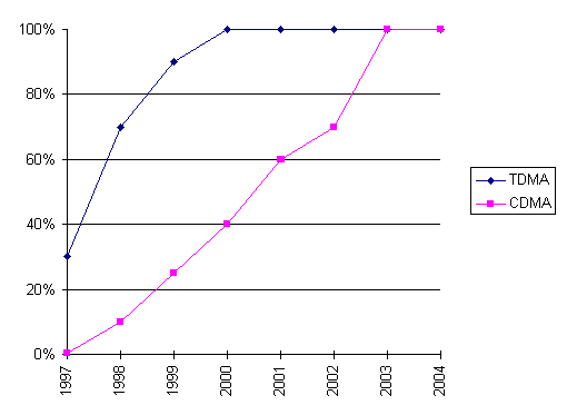 Herschel Shosteck & Associates says that TDMAs maturity, dropping handset prices and the AT&T marketing prowess will continue to power the growth of TDMA as a dominant standard in North America. Shosteck says CDMA has yet to reach maturity and also faces challenges of network tuning and higher handset prices, thus impeding system roll outs. He predicts by the year 2000, CDMA terminals will comprise 31% of total sales.
