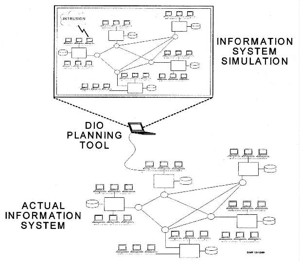 Figure 2 is an illustration of the running DIOPT simulation. Given the operational plans for deploying an Information System (IS), a simulation of the IS can be constructed using pre-developed models represented by icons. The IS planner can construct the simulation by interconnecting IS system icons representing pre-developed models of IS nodes and links that the planner understands. Models of threats to the IS system can then be used to assess the vulnerabilities of the system to various types of attacks. This can afford a planner the ability to determine how the IS architecture can be improved to reduce vulnerabilities, particularly to mission critical tasks, and to predetermine best courses of action to counter an attack. Once the IS is operationally deployed, the laptop can be plugged into the actual system to capture real-time data on IS architecture changes, malfunctions or suspected intrusions/attacks. This will cause alarms to summon the planner, to further investigate specified events automatically, and to aid in the rapid determination of the best courses of action to be taken.