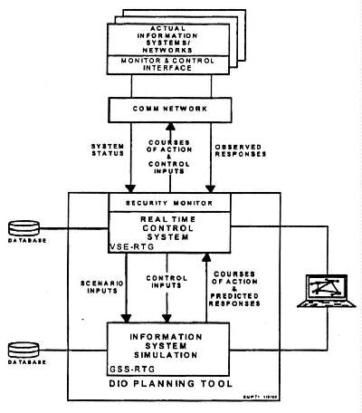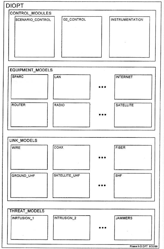 An intruder model has also been added to provide an initial demonstration capability, and establish a framework for the Phase II effort. This model now runs in a separate INTRUDER simulation, which can either be on the same physical computer as the DIOPT simulation, or on a separate computer networked to the DIOPT simulation. These facilities will be expanded in Phase II to take inputs directly from on-line sources to create new scenarios as well as update existing scenarios. These facilities will include direct connections to operations monitors, e.g., HP Open View. This will provide for automatic capture of the identity of equipment in the network, their topological connectivity, and the levels of traffic.