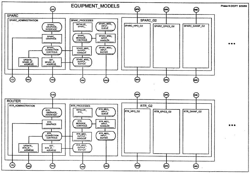 The top-level view of the DIOPT Simulation illustrated in Figure 4, shows the Equipment Models opened to the submodel level, where the SPARC, LAN, ROUTER, RADIO, INTERNET and SATELLITE, etc., models are represented. Figure 7 illustrates the push-down of two of these submodels, SPARC and ROUTER, through several additional layers, down to the GSS resource and process level. The SPARC submodel is discussed here as a typical example of a model hierarchy. In Phase II, all of the equipment models will be represented in detail.