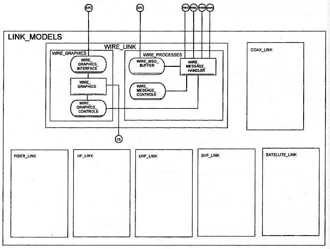 As all of the above models are brought together, the DIOPT Simulation, running in the General Simulation System and GSS Run-Time Graphics system environment is illustrated in Figure 2. Multiple equipment types are linked in this example network, along with intruders and instruments measuring various measures of performance. Having discussed a typical run-time simulation graphic view and the top-level model structure in Figures 2 and 4, respectively, subordinate model layers are presented in the following sections.