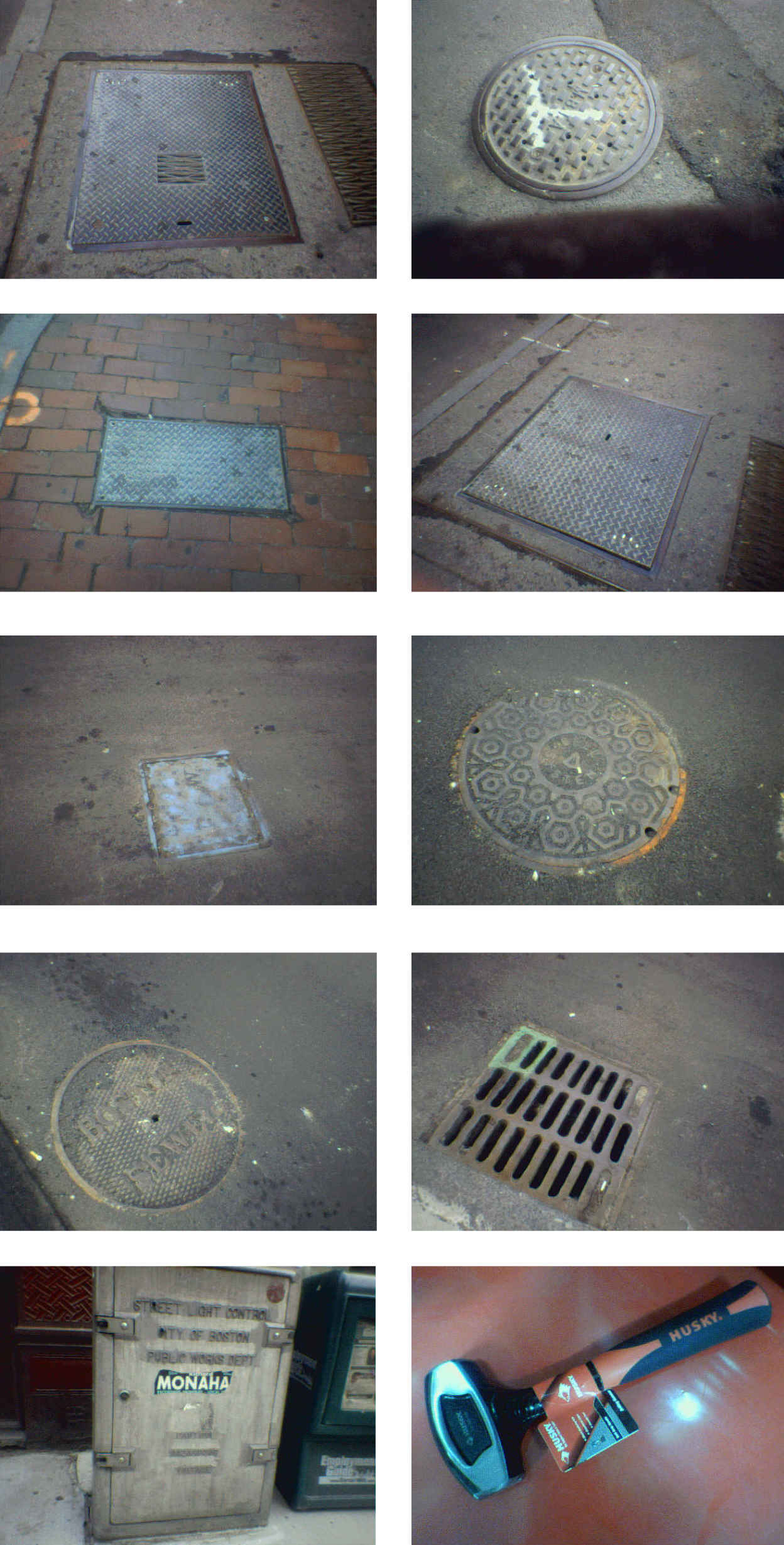 8. Insecure manholes.These photos show unsecured manholes, access panels and grates around Fleet Center. One appears to have been welded shut at one time, but was since re-opened to access the manhole. None of these grates and covers have been secured, and you really can not secure the cover until the area below it has been deemed safe. As this has not been done and the covers have not been secured there was no security concerning these underground areas. It would be EXTREMELY easy for someone to hide hundreds, if not thousands of pounds of explosives of chemical weapons in these unsecured areas at the DNC. Even if all of these areas were secure and the covers tack-welded shut the hammer at lower right can easily break tack-welds. |