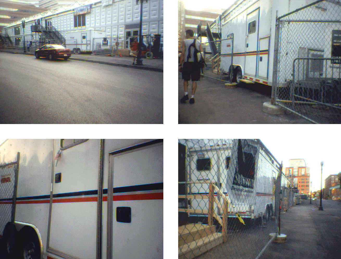 5. Unprotected telephone installation trailer.There are several of these Verizon special event communication trailer, and as you will no doubt notice there are no police or security people anywhere near it. Both the door, and the access panels are unlocked. Also, notice that the fence are not properly secured to the trailer, and that someone could easily slip between the trailer and the fence and gain full, unrestricted access to the DNC areas for hours at a time. These communications trailers are a major vulnerability as any damage to these during the DNC would cripple security and logistics (in the event of a security anomaly). Look carefully at the pictures and you may see a DNCC Security pass laying on the ground nearby (evidence of a clumsy workman). If someone were to pickup this security pass they could really cause some mayhem. |