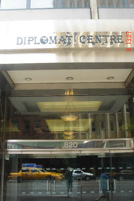 Access to the Diplomat Centre lobby was unlimited with a courteous security guard who did not recognize the name of the DPRK but offered a booklet on UN missions to confirm the DPRK address. Across the avenue an angry hard-nut Asian wielding a cellphone like a samarai sword looked as if he wanted to lop the head off the goofus photographing and videotaping Floor 13.