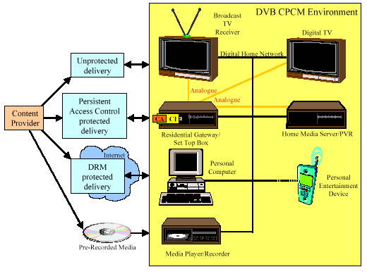 1 . The content is delivered from Content Providers through Service Providers to the Consumer using a variety of delivery means, including unprotected, protected (such as Conditional Access System (CAS) and/or Digital Rights Management (DRM)) and pre-recorded media.2. Where content enters the DVB CPCM environment, it may move from a traditional protection mechanism such as through a Residential Gateway (RG) or Set Top Box (STB) border device using the DVB Conditional Access (CA) system (and possibly across the DVB Common Interface (CI)) into the DVB CPCM environment. . It should be recognised that control of content protected by a CAS may or may not be handed off to the Baseline DVB CPCM system. It is also possible that the content enters through an unprotected environment (e.g. over a free-to-air public broadcast) before entering the DVB CPCM environment. Regardless of how the content enters the consumer's Authorised Domain, the DVB CPCM system shall provide end-to-end protection of the content and its related Usage States through the point of consumption by the end user