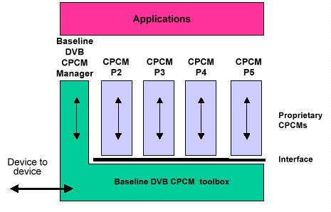 It comprises a DVB CPCM framework of tools which are used by the Baseline DVB CPCM system and can also be called on by a plurality of proprietary CPCM plug-ins ("Proprietary CPCMs"). The Proprietary CPCMs connect via a standardised interface to the Baseline DVB CPCM tools.