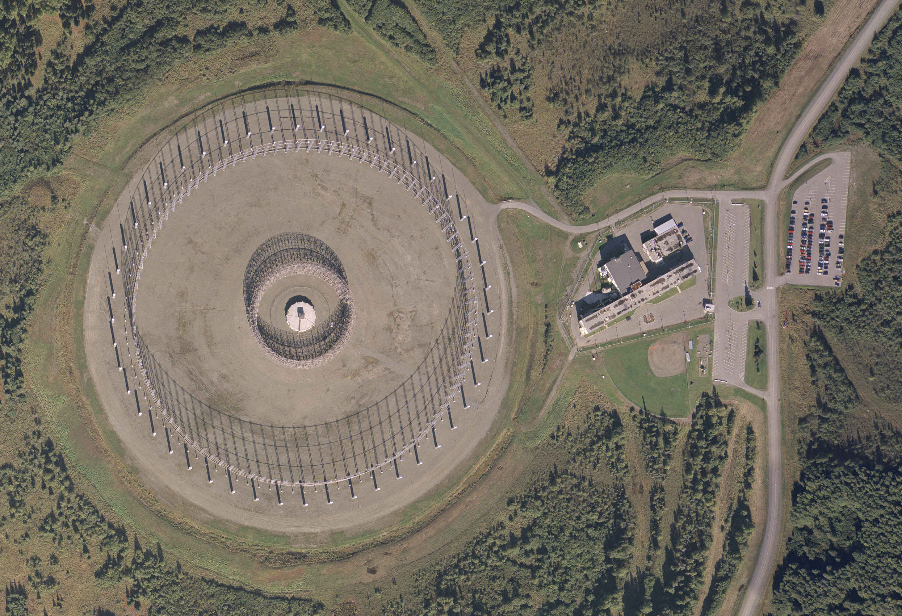 Each antenna consisted of an inner ring 230 metres in diameter, consisting of 40 individual folded dipoles, and an outer ring about 260 metres in diameter consisting of 120 monopoles. The whole array is surrounded by a ground shield some 400 metres in diameter. The arrangement permits accurate direction finding of signals from up to 5000 km away.