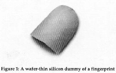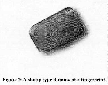 Duplication of a fingerprint with co-operation of its owner is of course the easiest method since it is possible to compare the dummy with the original fingerprint on all aspects and adapt it accordingly. First, a plaster cast of the finger is created. This cast is then filled with silicon rubber to create a wafer-thin silicon dummy (see also Figure 1). This dummy can be glued to anyone's finger without it being noticeable to the eye. For a thorough description of how to create such a dummy, we refer to Appendix A which describes the materials and tools that can be used. From the appendix it follows that creation of this type of dummy is possible with very liniited means within a few hours.