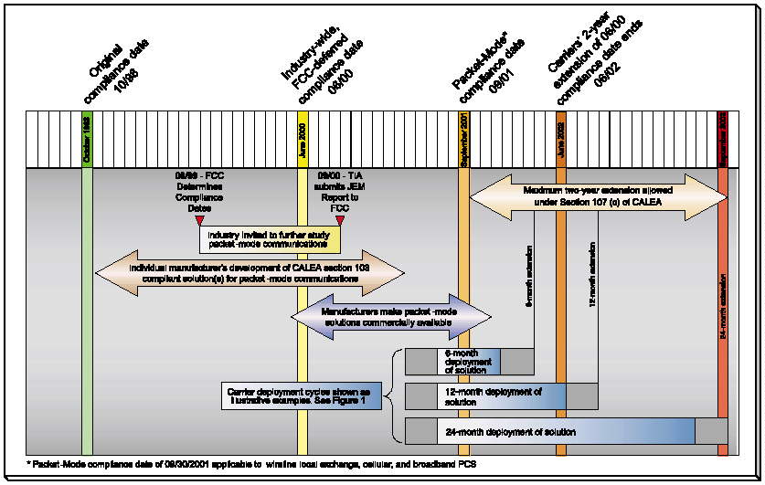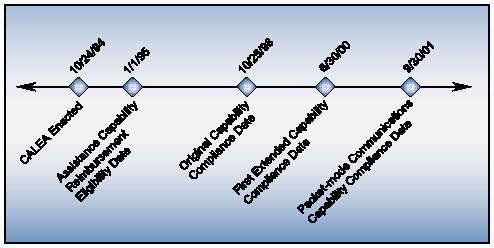 The original assistance capability compliance date for CALEA, October 25, 1998, was extended by the FCC10 for J-STD-025 to June 30, 2000. The FCC determined that carriers could not comply with the original October 25, 1998 compliance date because of the absence of available technology during the compliance period.