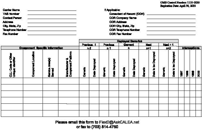 Carriers that do not have access to the Internet and wish to acquire the Flexible Deploytnent Assistance Guide Template in electronic form can request 3.5 inch diskettes containing the electronic template from the address and/or telephone listed below. Carriers may either submit a completed Flexible Deployment Assistance Guide Template in electronic form (e.g., Microsoft Excel") or use the Flexible Deployment Assistance Guide Template provided in Appendix D of this Guide. Carriers are strongly encouraged to file their Flexible Deployment Assistance Guide Templates by September 30, 2001, and all completed Flexible Deployment Assistance Guide Templates should be sent to only one of the following: