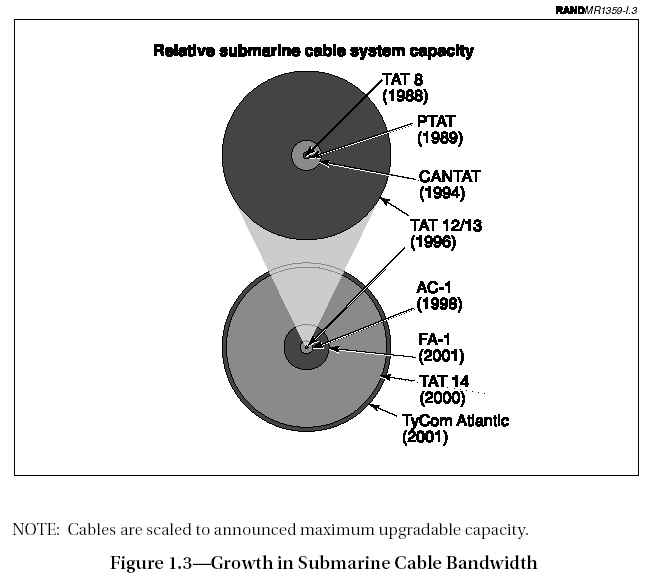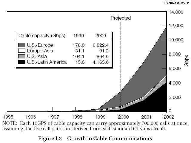 Over the past decade, the increased demand for bandwidth driven by the Internet, as well as the continuing international trend of privatization of national telecommunications industries, has outstripped by far the resources offered by satellite transmission of voice and data (Petit, 1999). Instead, the fraction of transoceanic voice and data transmitted over undersea cables has grown in the past 12 years from 2 percent to as high as 80 percent in 2000 (Mandell, 2000). As demand has grown, so have the numbers of cables on the seabed. While experts differ on whether the worlds fiber optic network faces a capacity glut or crunch,1 it is certain that demand for higher bandwidth will continue to grow, and with it, the capacity of cablesthose currently existing and those soon to be laidto grow hand in hand. Due to be completed this year, for instance, is the Southern Cross cable network, offering a quantum leap in carrying capacity in the Southern Pacific (up to 160 gigabytes per second) in a three-tiered ring totaling some 29,000 kilometers. Similarly advanced systems are due to come on-line in the North Atlantic as well, increasing the total transatlantic carrying capacity to more than 1,000 gigabytes per second, enough capacity for the contents of 200 compact discs to be transmitted every second (McClelland, 2000).