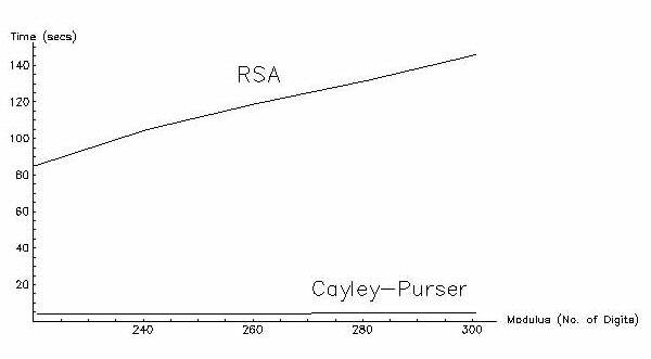 1. The most significant difference between the RSA and the Cayley-Purser algorithm is the fact that the Cayley-Purser algorithm uses only modular matrix multiplication to encipher plaintext messages whereas the RSA uses modular exponentiation which requires a considerably longer computation time. Even with the powerful Mathematica function PowerMod the RSA appears (see Tables I - IX) to be over 20 times slower than the Cayley-Purser Algorithm.