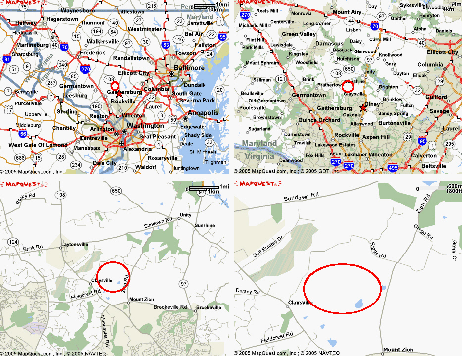 [{Koch, M} Dec. 2002 - First of all, Laytonsville and Derwood aren't anywhere near each other. Although they're not in different parts of the state they're not close enough to possibly have anything to do with each other. The site is located in Olney. I know it's sometimes common to use the largest nearby town as an actual location instead of the nearest town but Olney is not only closer it's also larger. (two miles away, not ten or fifteen)