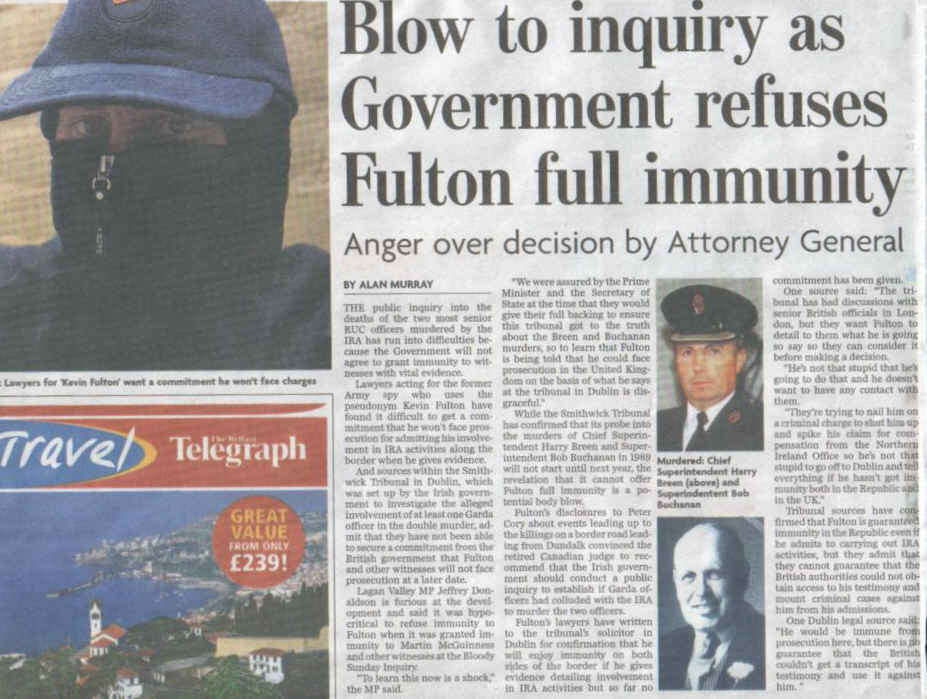 And sources within the Smithwick Tribunal in Dublin, which was set up by the Irish government to investigate the alleged involvement of at least one Garda officer in the double murder, admit that they have not been able to secure a commitment from the British government that Fulton and other witnesses will not face prosecution at a later date.