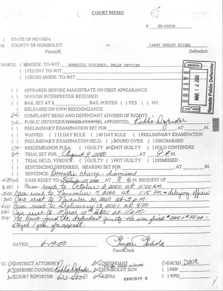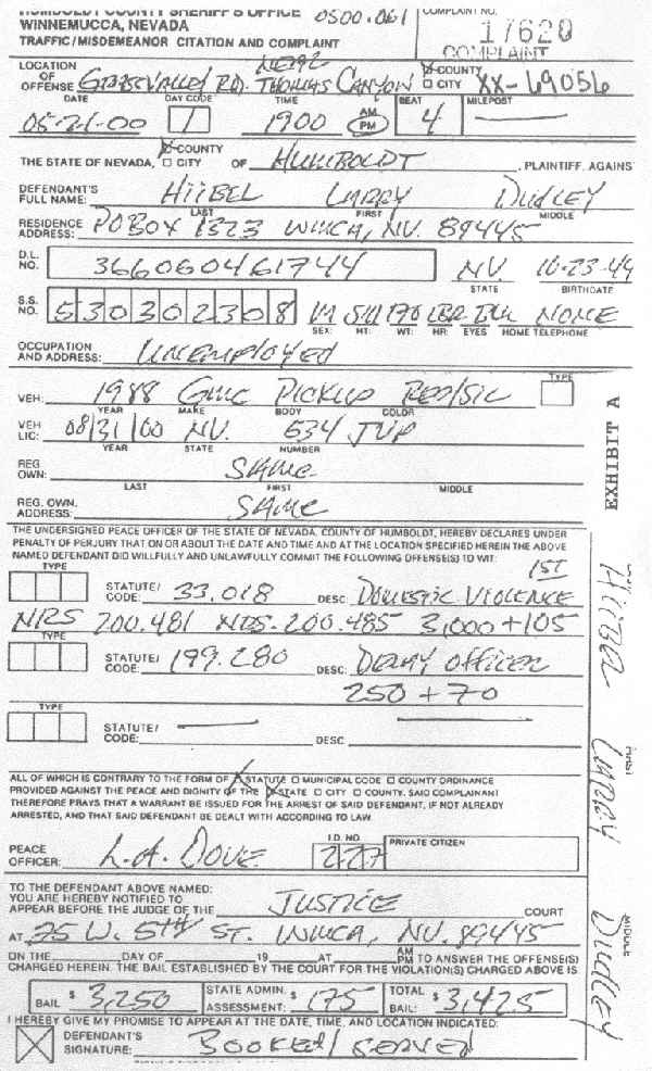 The Petitioner, Larry Dudley Hiibel, was originally charged with Domestic Battery and Resisting a Public Officer on May 21, 2000. Exhibit A. However, the Domestic Battery charge was later dismissed upon the motion of the State. Exhibits B, C. A trial was held in the Justice Court of Union Township, in and for the County of Humboldt, State of Nevada. Exhibits G, H. Mr. Hiibel was convicted. Exhibits D, E.