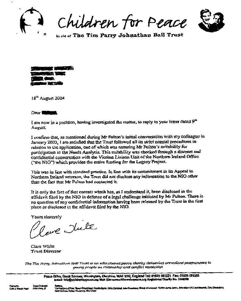 But in a letter sent to Mr Fulton she said: "This suitability was checked through a discreet and confidential conversation with the Victims Liaison Unit of the NIO, which provides the entire funding for the Legacy Project.