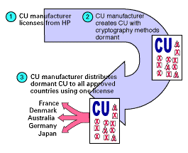 Hewlett-Packard provides the CU manufacturer with developer guidelines and tools. The CU can be manufactured as an independent card, an integrated chip, or anything else the CU vendor deems appropriate. During its development, the encryption methods in the CU are rendered dormant using Hewlett-Packard's patented touch points.