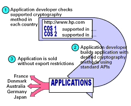 Application developers will be able to see which COS are supported by which national and business domains so they can develop applications using encryption methods supported by the countries in which they want to sell. An application developer wanting to sell e-commerce software using strong encryption in Europe and the U.S. would use a strong encryption method common to all European and U.S. policies.