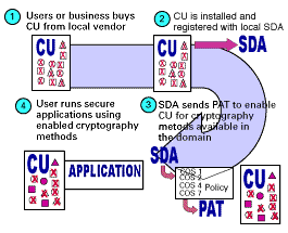 One or more Classes of Service are then packaged into a Policy Activation Token that represent the policy for that domain. SDAs agree to have at least one COS that provides a key recovery option. When a CU is shipped to an SDA domain, it registers with the SDA and is given a PAT that identifies all supported encryption methods within that domain. The PATs are installed in the CU and encryption is enabled for that device. All applications using standard APIs can use the encryption methods enabled on the CU.