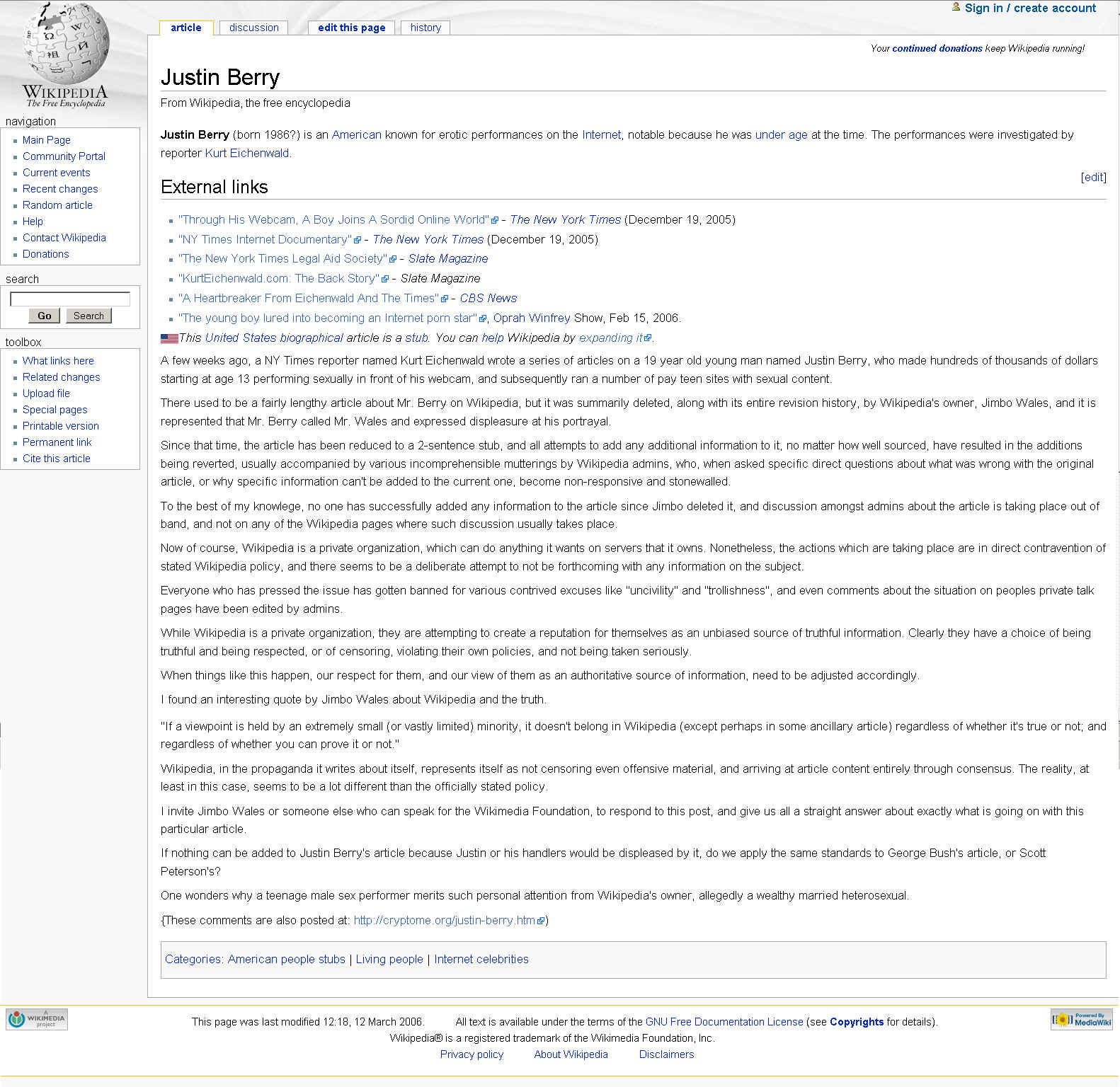 The censored original Justin Berry article (via Justin Berry;Talk):