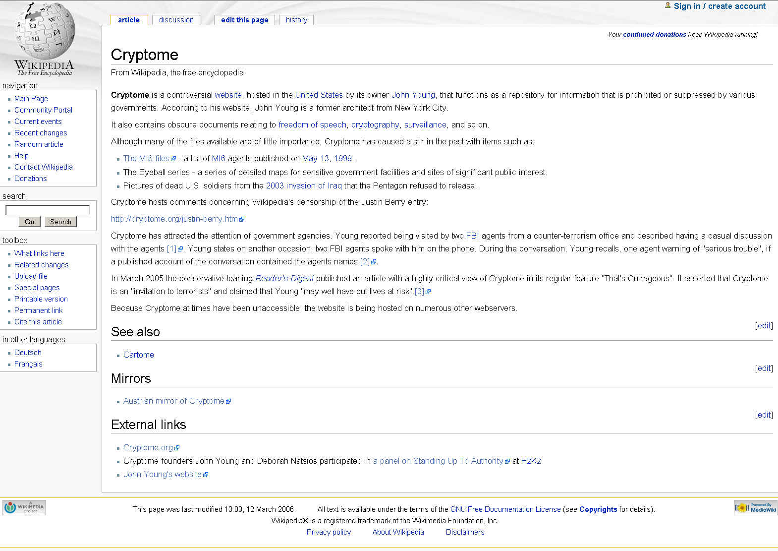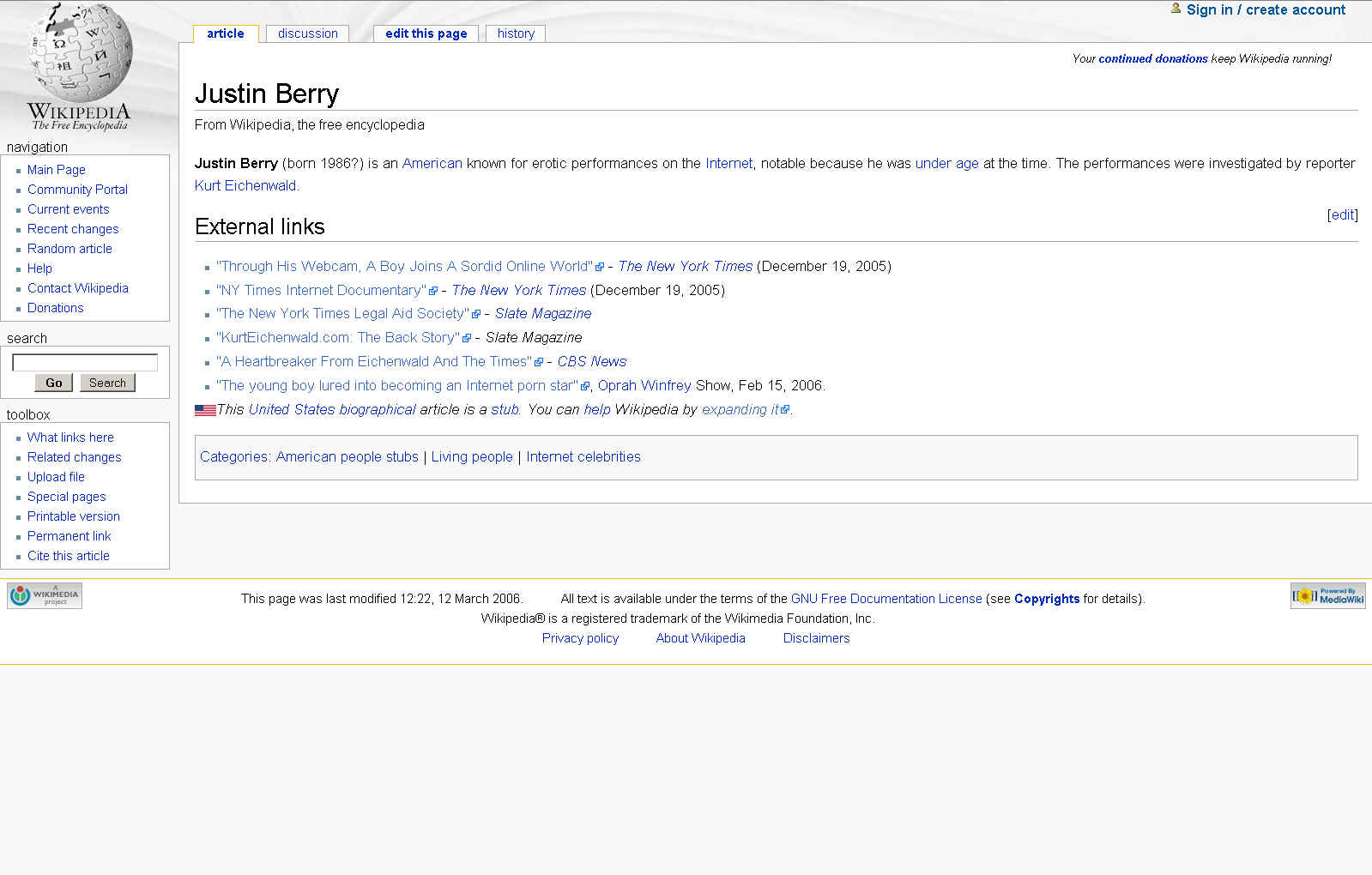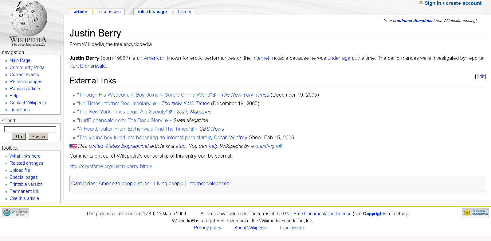 12 March 2006. See Wikipedia Justin Berry revison history and Cryptome revision history to track editing; both entries are now locked against revisions.